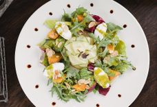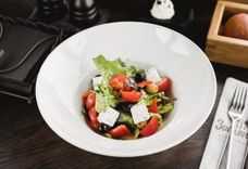 540/60/4 г • Томат, огурец, перец, черри, редис, опивки, маслины, сельдерей, салатный микс, соус «цацики», зелень