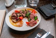 120/100/45 г • Говядина, горчица, каперсы, маслины, оливки, круток, красный лук, руккола, огурцы консервированные, оливковое масло