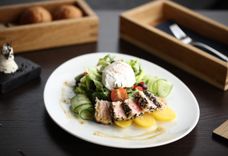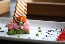 120/30/2 г Копченая свиная вырезка под соусом из тунца, с черри и салатным миксом. предварительный заказ от 5 порций