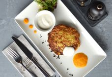 80/60/30/30/2 г • Филе белой рыбы домашнего копчения с хрустящими овощными рёсти и соусом «Тар-тар»
