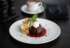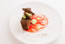 100/30/5 г • Шоколадный бисквит с ореховым крамблом и легким клубничным соусом