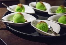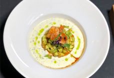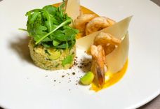 80/80/60/30/10 г • Обжаренные тигровые креветки подаются с кускусом, кабачком и нежном соусом из тыквы на кокосовом молоке