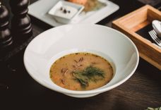 280/30/2 г • Грибы белые, шампиньоны, вешенки, крупа перловая, картофель, морковь, лук, бульон овощной, сметана, зелень