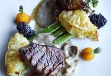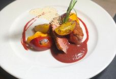 140/150/100/3 г • Утиное филе, обжаренное с яблоками и виноградом. Подается на рисовой подушке с сухофруктами и соусом из красного вина