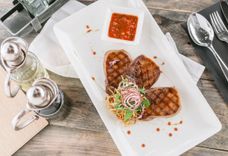 140/40/30/2 г • Нежный говяжий язык, обжаренный на гриле. Подается с пикантным соусом «Сальса» и овощным миксом
