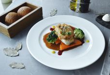 120/120/45 г • Филе судака запеченное под миндально-кокосовой шапкой, подается с печеной тыквой, бланшированной брокколи и имбирно-соевым соусом
