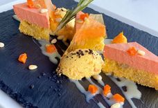 120/20/25/3 г • Сливочный десерт с воздушным бизе и песочным печеньем, кули из маракуйи с облепиховым сорбетом и печёным шоколадом в оригинальной подаче от шеф-повара
