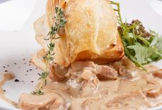 120/40/1 г • Нежный сливочный соус с белыми грибами и беконом на воздушной подушке слоёного теста, запеченного с сыром Бри
