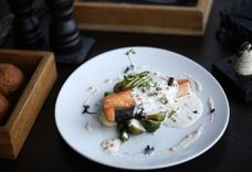 100/90/60/35 г • Нежное филе семги, обжаренное в сливочно-икорном соусе с овощным гарниром