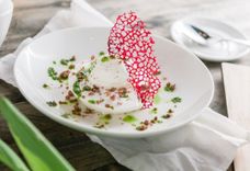 280/5 г • Нежный согревающий крем-суп из пастернака. Подаётся с чипсами из имбиря и миндальными хлопьями.