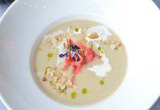 150/150/2 г • Сливочный суп с томленым лососем, креветкой, авокадо и пастернаком