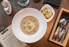 280/40/2 г • Карамелизованный лук в овощном бульоне с добавлением белого вина и ароматных специй. Подается с хрустящими гренками с сыром