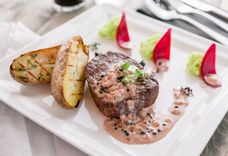 180/200/80/2 г • Сочный стейк из говяжьей вырезки подаётся с соусом на выбор: из зеленого перца или под соусом «Шатобриан». В качестве гарнира предлагается запеченный картофель или овощи на гриле *гарнир и соус на выбор