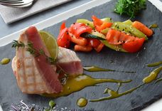 110/100/40/30 г • Обжаренное филе тунца под апельсиново-имбирным соусом. Подаётся с карамелизированными овощами, долькой лайма